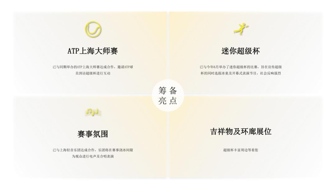 除了精彩纷呈的冰上赛事,其他亮点也颇多。主办方将特邀同期举办的ATP上海网球大师赛“大师”级球员到访超级杯进行互动。2024上海超级杯在今年6月举办了迷你超级杯的比赛,脱颖而出的选手将为赛事开幕式带来精彩表演,并担任赛事冰童的角色。上海轻音乐团将在赛事浇冰间隙为观众进行电声及合唱表演,还有吉祥物及环廊展位,展售超级杯丰富周边。五星体育全媒体平台将对赛事进行直播,并在转播中运用AI技术,360度慢动作回放,丰富观看体验。同时还将通过上海广播电视台旗下看看新闻Knews平台以及上海文广国际传播中心的海外平台进行全球直播。这不仅是一场体育竞技的盛会,更是体育精神与粉丝热情的深度交融。