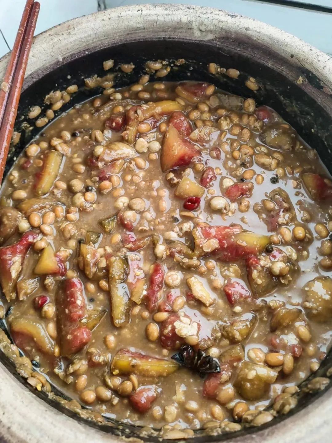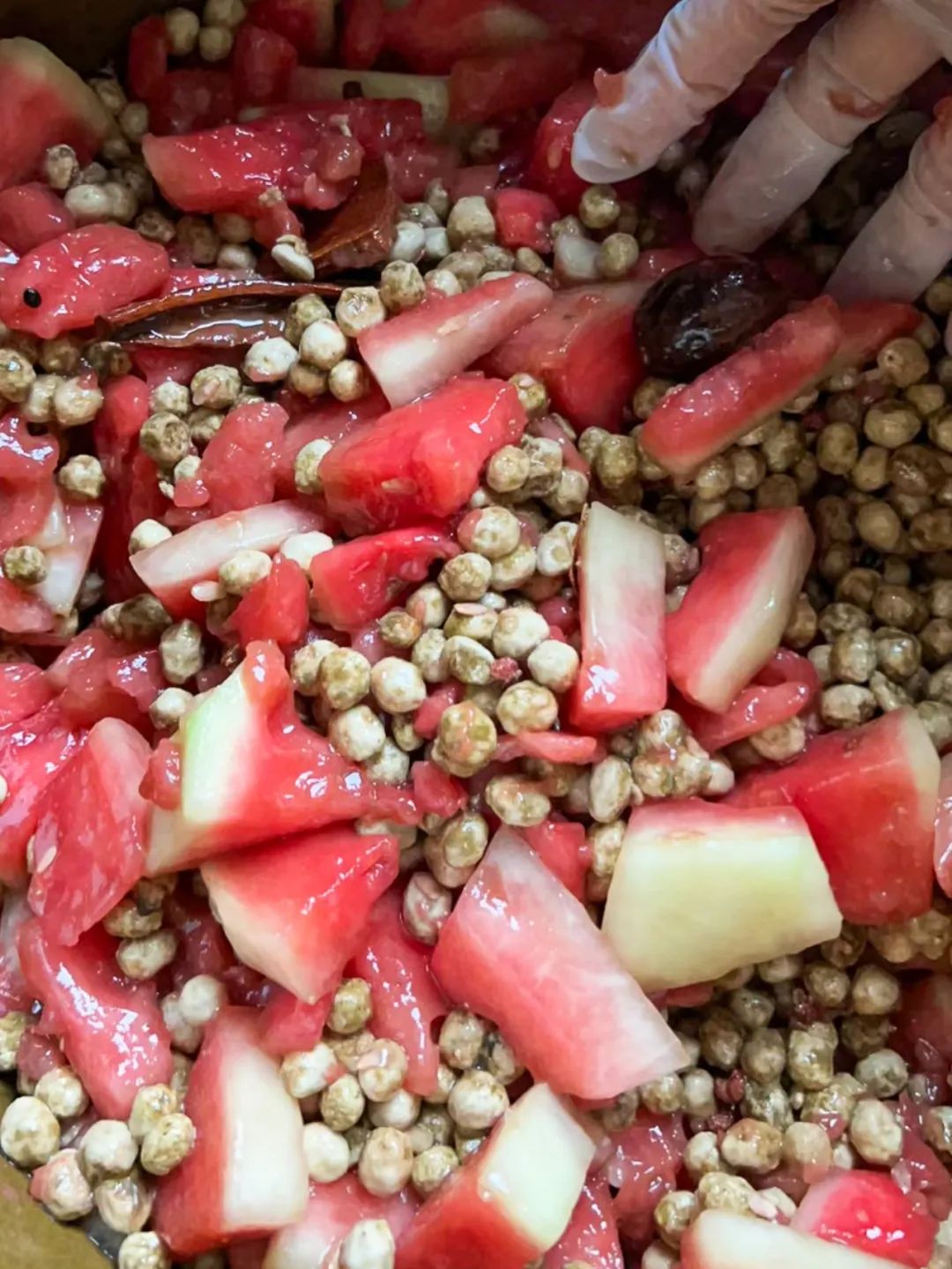瓜太多了,就会有个显而易见的问题:吃不完。为了不浪费瓜田里蓬勃生长的西瓜,河南人从黄豆酱上找到把西瓜留存得更久的灵感:甘甜的西瓜果肉,搭配上霉过的黄豆,两者合抱之后,一起在阳光下发酵成“西瓜酱”!我家每位成年女性,都有一手做西瓜酱的技艺。尤其我姑姑亲手做的西瓜酱,得到方圆几里亲戚朋友们的认可。她每年夏天都坚持要晾晒西瓜酱,和她聊天,大约不出十句话,就能拐到西瓜酱上。今年她因工作去到新疆,但最惊喜的却不是工作上的创新,而是新疆也能做西瓜酱,而且过去在河南则需要半个月起的酱,在新疆只需要一天就能基本晾晒成!而且她说新疆昼夜温差大,西瓜似乎更甜一些,电话里,她兴奋地像个孩子。