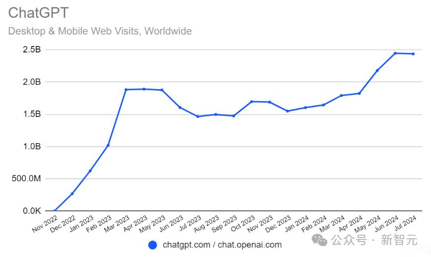 ChatGPT的全球用户正在迅速增长:从2022年11月到2024年7月,桌面和移动访问量激增,在6月和7月达到近25亿次访问的峰值而其他指标,也显出了对OpenAI服务的强劲需求。