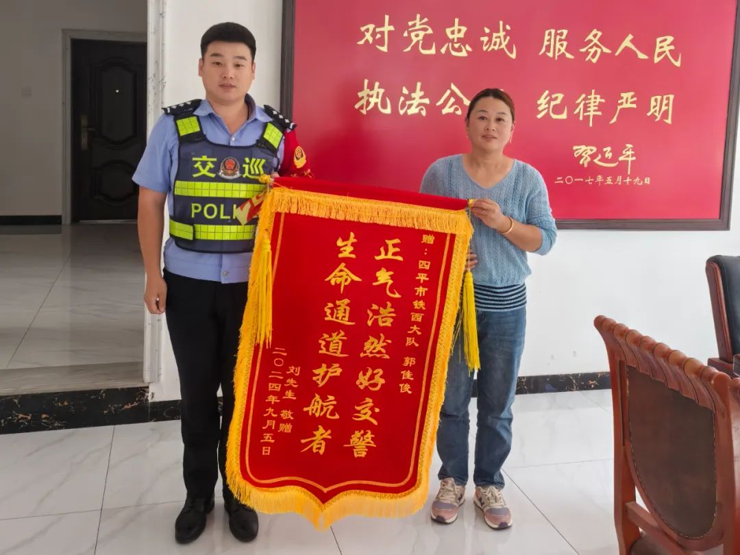 近日,一位女士来到四平市公安局交管支队铁西大队新华中队,将一面印有“正气浩然好交警 生命通道护航者”的鲜红锦旗送到新华中队警员郭佳俊手中,并表示由衷的感谢。