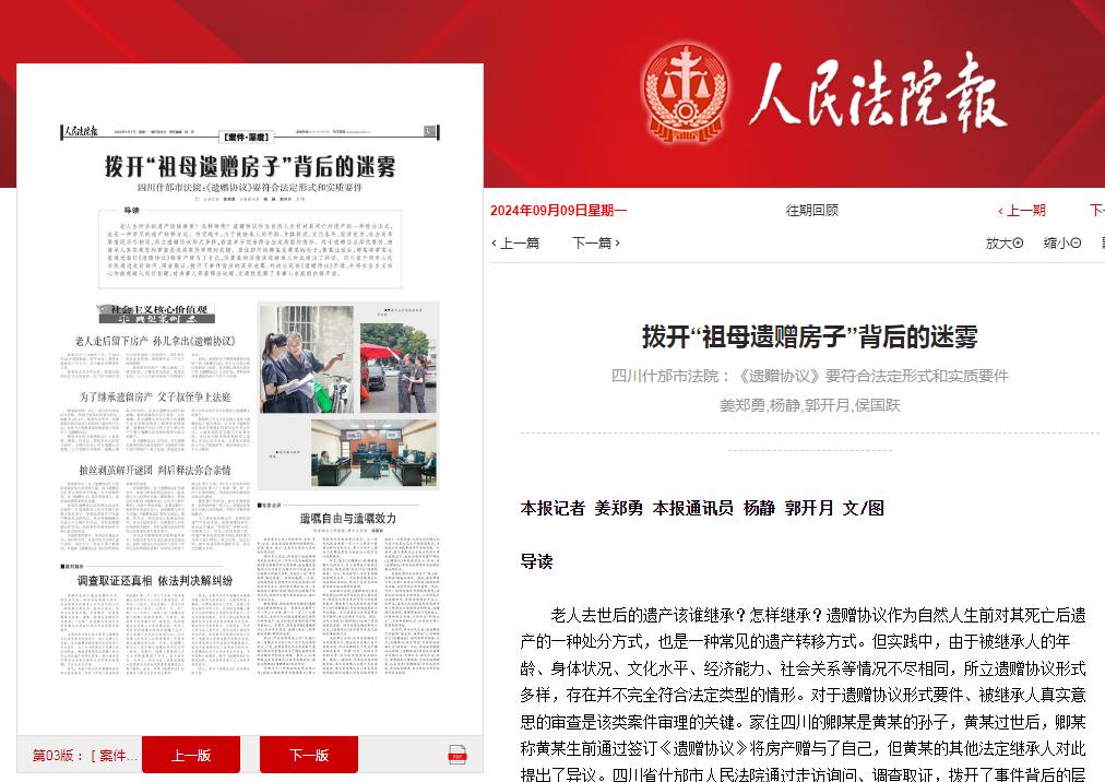 整版 · 聚焦2024年9月9日,《人民法院报》以《拨开“祖母遗赠房子”背后的迷雾 四川什邡市法院:〈遗赠协议〉要符合法定形式和实质要件》为题,整版报道什邡法院将社会主义核心价值观融入司法裁判的典型案例。