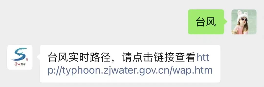 台风实时路径查询关注“萧山发布”公众号,进入萧山发布公众号对话界面,发送“台风”或“台风路径”,即可查看台风实时路径。