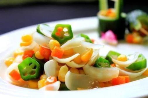 材料:秋葵、百合、胡萝卜、玉米粒、蒜、油、盐、酱油。做法:秋葵洗净,焯水,焯水后的秋葵迅速过冷水,晾凉切片;胡萝卜去皮洗净,切片;鲜百合去掉两端,一瓣一瓣地剥开洗净;熟玉米粒洗净。起油锅爆香蒜末,加入胡萝卜翻炒,炒至变软后加入玉米粒和秋葵翻炒,最后加入百合翻炒至百合透明,再加入盐、少许酱油调味即可。