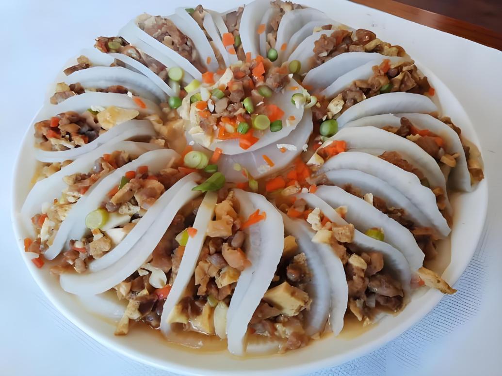 材料:半根白萝卜、五花肉馅。做法:将白萝卜去皮、切片、焯水,待稍微软化后捞出,沥干水分。在萝卜片内加入适量拌好的五花肉馅后对折,摆入盘中。最后将摆好的白萝卜夹肉放入蒸锅中,开大火蒸,将肉馅蒸熟即可。