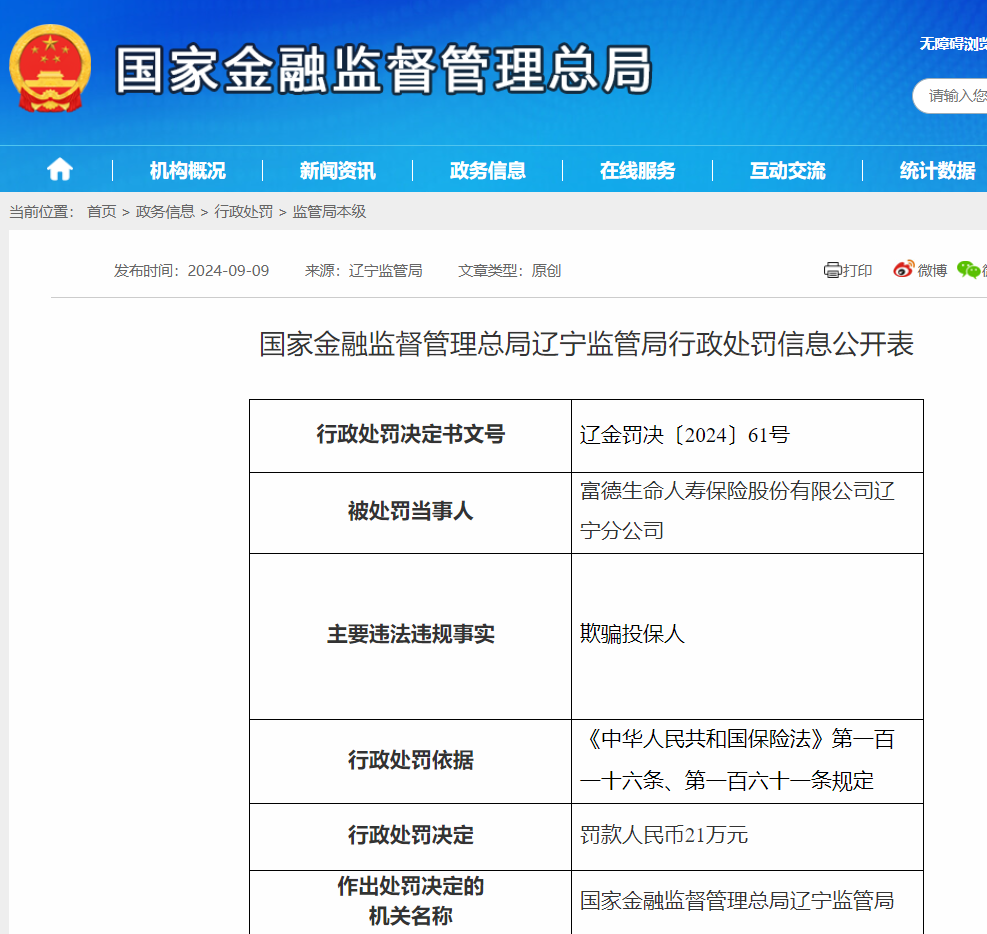 欺骗投保人!富德生命人寿辽宁分公司被罚款21万元