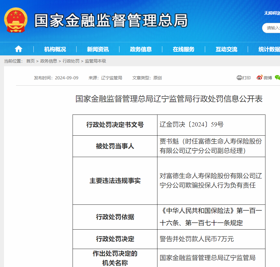 与此同时,富德生命人寿辽宁分公司时任副总经理贾书魁对该公司欺骗投保人行为负有责任,被处以警告并罚款7万元处罚。