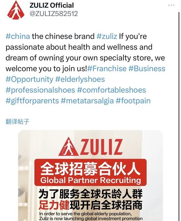 今年年初,“足力健”开始为“ZULIZ”出海物色合伙人。“致力于服务全球老年人群,足力健现面向全球诚邀合作伙伴。”同期,“ZULIZ”通过海外社交媒体X(原名Twitter)发布全球合伙人招募信息。