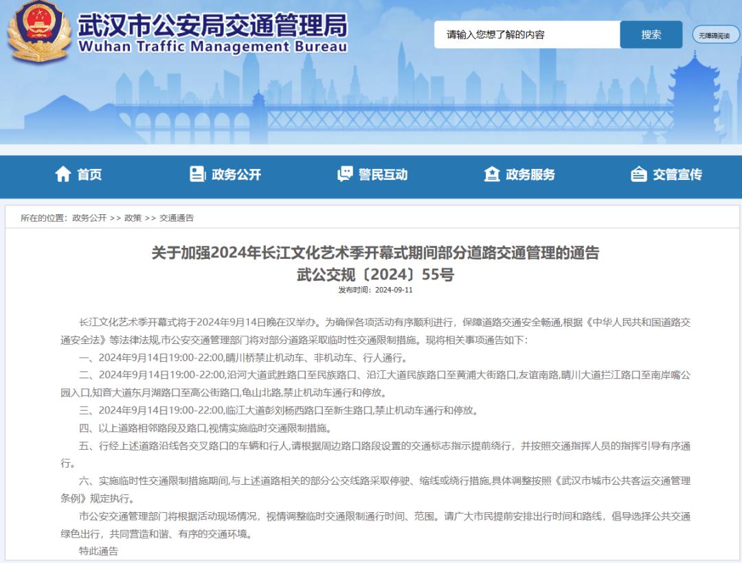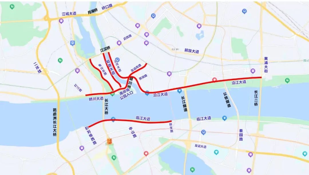 沿河大道武胜路口至民族路口、沿江大道民族路口至黄浦大街路口,友谊南路、晴川大道拦江路口至南岸嘴公园入口,知音大道东月湖路口至高公街路口,龟山北路,临江大道彭刘杨西路口至新生路口禁止机动车通行和停放;以上道路相邻路段及路口,视情实施临时交通限制措施。