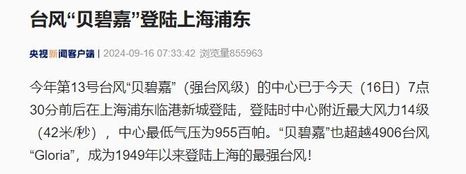 今年第13号台风“贝碧嘉”(强台风级)的中心已于今天(16日)7点30分前后在上海浦东临港新城登陆,登陆时中心附近最大风力14级(42米/秒),中心最低气压为955百帕。“贝碧嘉”也超越4906台风“Gloria”,成为1949年以来登陆上海的最强台风!