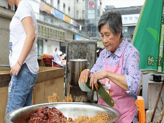 到了上午8、9点钟,差不多就准备齐全了,往店面上一坐,一边包粽子一边看店铺,游客只要一看到阿婆在包,就像一块活招牌,根本无需招呼就会来买上几个!