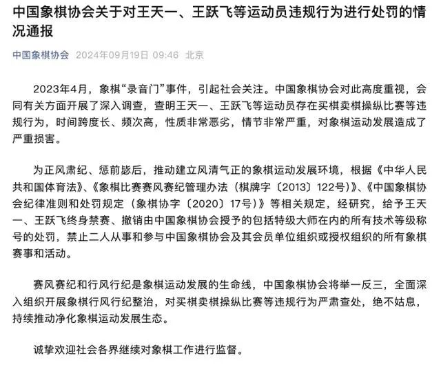9月19日,中国象棋协会发布关于对王天一、王跃飞等运动员违规行为进行处罚的情况通报: