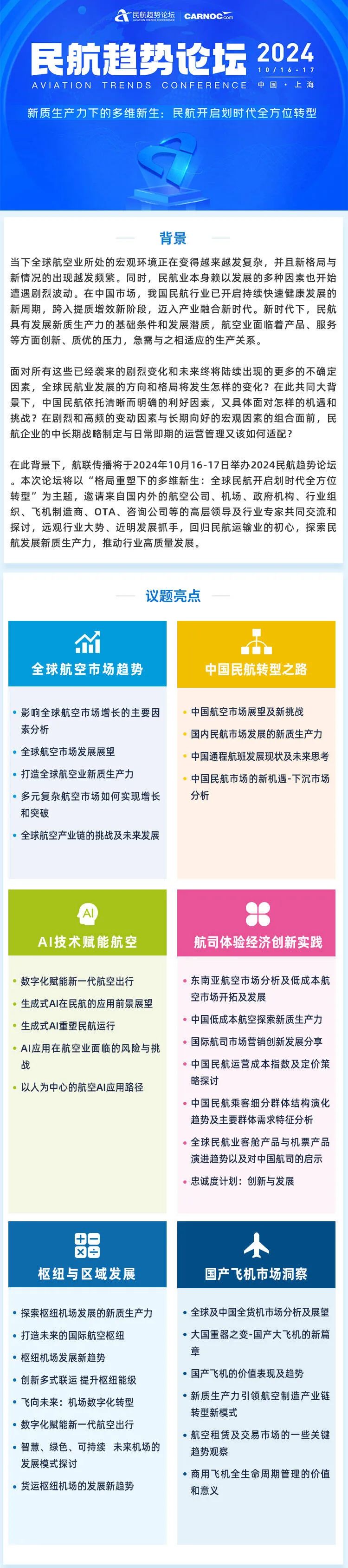 鉴于此,航联传播定于2024年10月隆重举办“2024民航趋势论坛”。本次论坛以“新质生产力引领多维新生:民航业迈向划时代全方位转型”为核心议题,诚邀国内外顶尖航空公司、机场管理者、政府机构代表、行业权威组织、知名飞机制造商、在线旅行平台(OTA)、以及资深咨询机构的高层与专家共襄盛举,旨在通过深度交流与思想碰撞,洞悉行业长远趋势,明确发展路径,不忘初心,共同探索民航业新质生产力的培育路径,携手推动行业向更高质量、更深层次的发展阶段迈进。