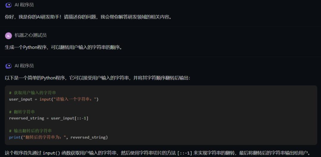 首先我们来考验一下 AI 程序员的基本功:生成一个 Python 程序,可以翻转用户输入的字符串的顺序。