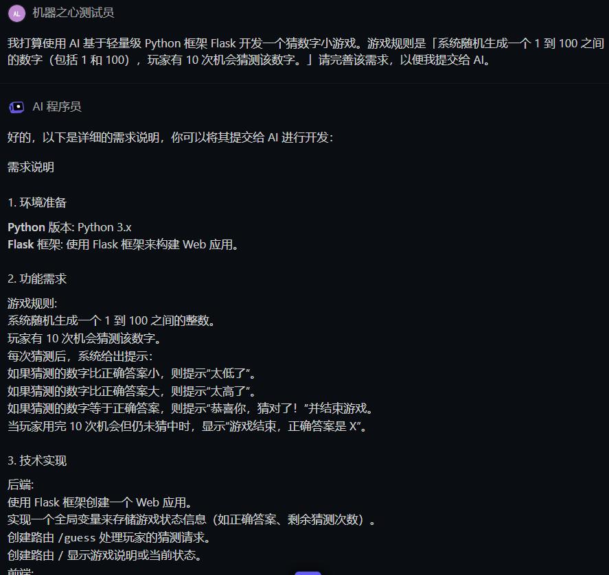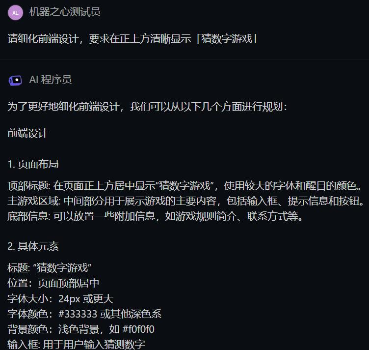 AI 程序员生成的完整需求较长,此处并未完整展示。当然,你也可以与 AI 程序员进行讨论,逐步调整具体需求的细节,比如我们可让 AI 程序员细化前端需求,以便后续生成更符合我们审美的游戏界面。