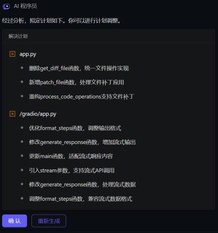我们让 AI 程序员简单地分析了这个项目并提出了改进意见。点击「确定」,AI 程序员就能替我们完成代码改进。
