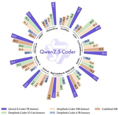 这样的应用体验,离不开基础大模型能力的提升。在阿里云昨天上午发布的通义千问 Qwen 2.5 系列模型中,就包括一个针对编程任务微调的模型 Qwen2.5-Coder(目前有 1.5B 和 7B 版,即将推出 32B 版),其在多项评估基准上都取得了卓越表现。