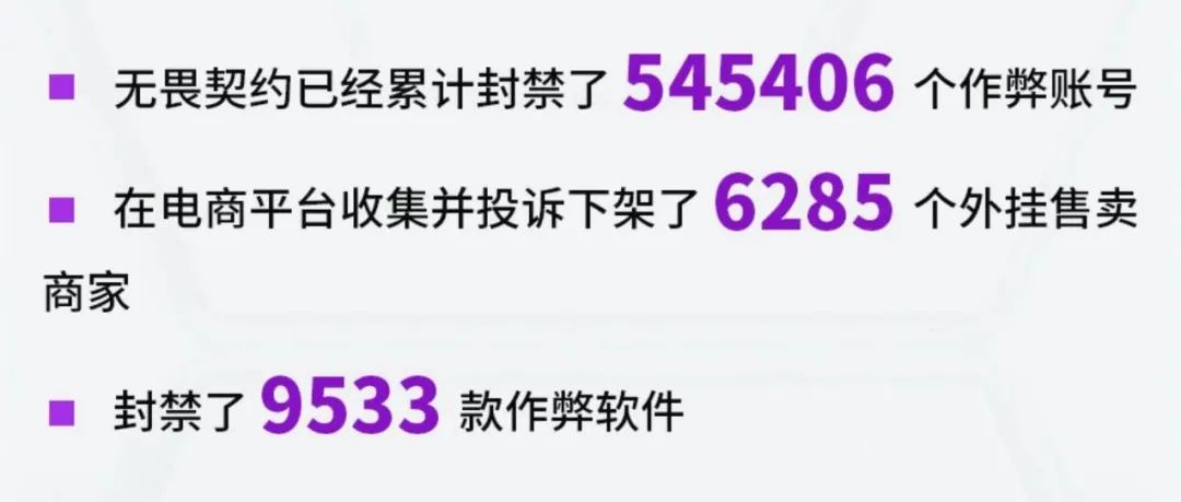此前,无畏契约国服已经累计封禁了5405406个作弊账号,在电商平台收集并投诉下架了6285个外挂售卖商家,封禁了9533款作弊软件。