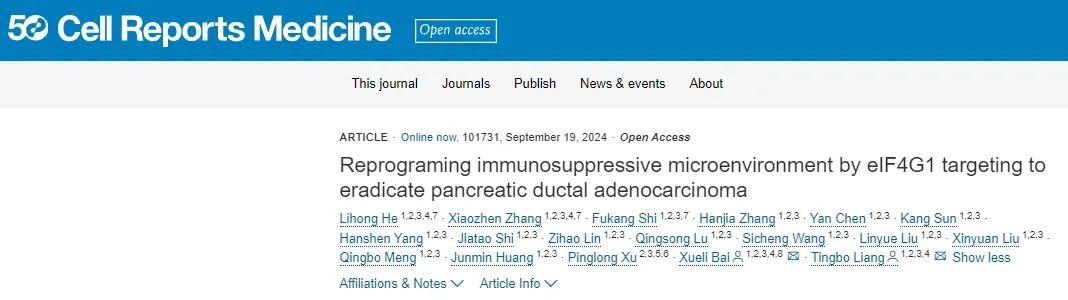 9月19日,浙江大学梁廷波/白雪莉教授研究团队在期刊《Cell Reports Medicine》上发表了研究论文,题为“Reprograming immunosuppressive microenvironment by eIF4G1 targeting to eradicate pancreatic ductal adenocarcinoma”,本研究中,研究人员发现,eIF4F的亚基之一eIF4G1在癌细胞和癌相关成纤维细胞中过表达,并且与胰腺癌患者的不良预后相关。在胰腺癌小鼠模型中,eIF4G1抑制可限制肿瘤进展并延长总体生存期,尤其是与PD1/PDL1拮抗剂和吉西他滨联合使用时。机制上,eIF4G1抑制可阻碍促进纤维化的细胞因子和趋化因子的产生,并抑制杀伤性T细胞的迁移。此外,eIF4G1抑制可降低整合素β1蛋白的翻译,并通过FAK-ERK/AKT信号通路发挥抗肿瘤作用。这些发现强调了eIF4G1对肿瘤免疫依赖性和独立的影响,并表明eIF4G1是治疗胰腺癌的有前途的靶点。