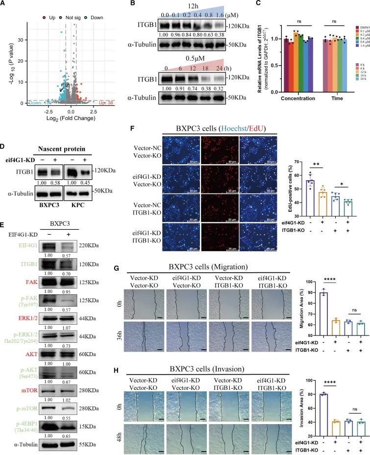 如上所述,在裸原位KDA小鼠模型和皮下PDX小鼠模型中,较高剂量的SBI-0640756也抑制了肿瘤生长,表明eIF4G1通过非免疫反应发挥直接抗肿瘤活性。既往研究表明,eIF4G1和相关的eIF4F可能作为促癌信号通路的下游分子发挥作用,并导致相关蛋白的选择性合成。为了确定抑制eIF4G1是否也可以抑制上游基因的翻译启动和失活促癌信号通路,研究人员在BxPC3细胞中对eIF4G1- kd组和对照组进行了蛋白质组学分析。与对照组相比,eIF4G1-KD组ITGB1表达明显下调。研究人员研究了不同剂量eIF4G1i或不同时间处理的细胞中ITGB1的表达。BxPC3和KPC细胞经eIF4G1i处理后,ITGB1蛋白水平较对照组降低,且呈时间和浓度依赖性,但ITGB1 mRNA表达无明显变化。PDAC细胞中eIF4G1 KD显著抑制ITGB1蛋白的合成。这些结果表明,eIF4G1通过影响翻译来决定ITGB1蛋白的表达。