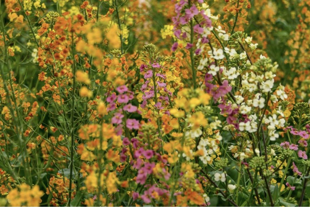每逢春末夏初,大田中试种的七彩油菜便会竞相开放,白色、黄绿、橘黄、粉红、桃红、橙红、紫色,随风摇曳,淡淡清香扑面而来,沁人心脾。相比传统的观赏油菜,农业与生物技术学院教授周伟军团队培育的浙大七彩油菜花颜值高、花期长、色彩丰富,兼具观赏、食用、榨油、蜜用、饲用、肥田等功能。与传统的观赏油菜相比,出油率高,每亩能够收获150公斤左右的油菜籽,在长江流域冬油菜产区以及青藏高原等春油菜产区示范和应用。