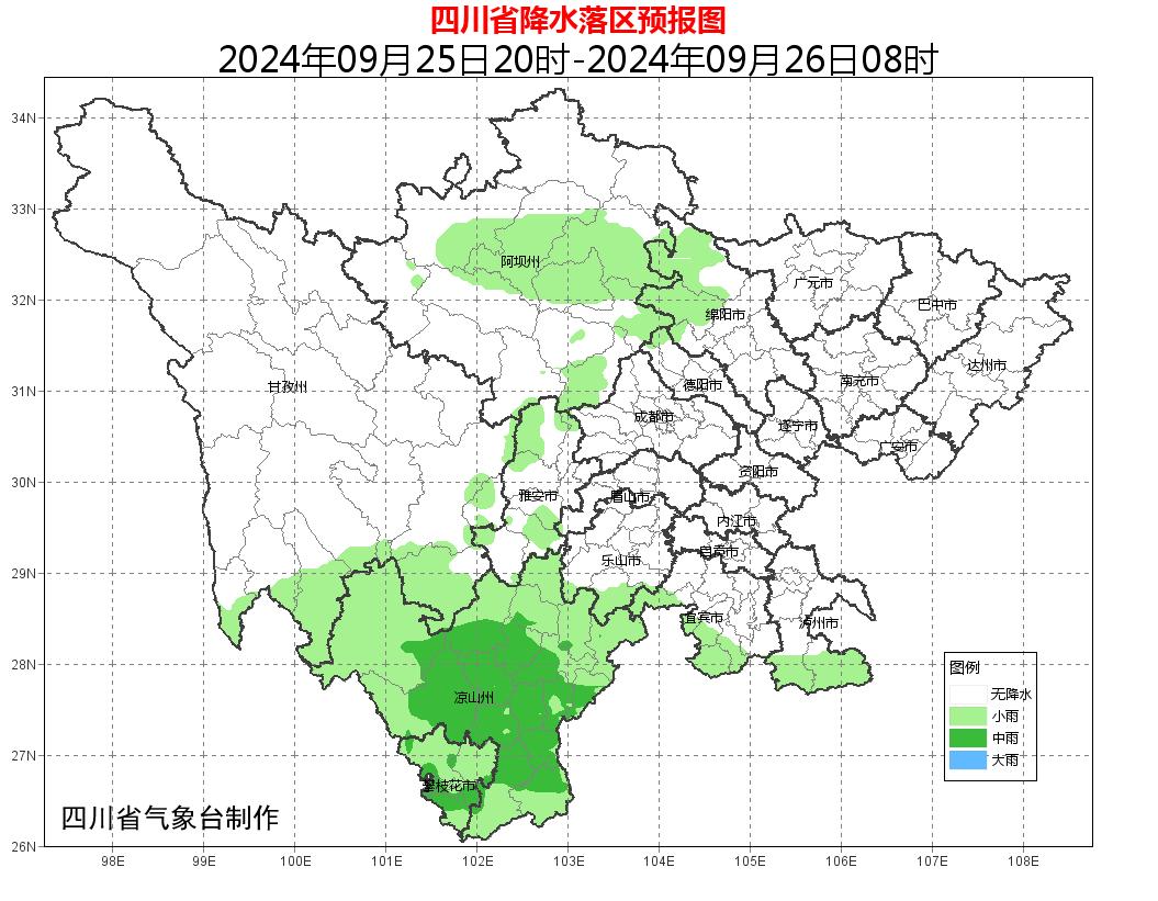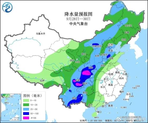 9月25日-10月1日,四川盆地大部以多云间阴为主,有分散阵雨或雷雨。其中,9月29日-10月1日,四川省有一次较明显的降雨天气过程,盆地大部地方小到中雨,北部东部有大雨,局部暴雨或大暴雨;川西高原和攀西地区小到中雨,局地大雨,个别暴雨。川西高原和攀西地区雨日较多,部分地方累计雨量大,需防范强降水带来的滑坡、泥石流等气象次生地质灾害。