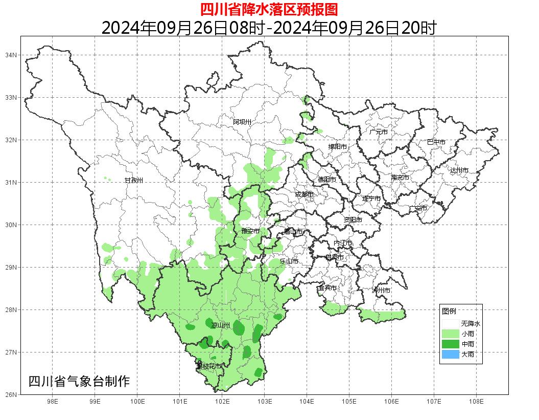 盆地大部多云间晴,西部、南部沿山有分散阵雨或雷雨;川西高原大部以多云间晴天气为主,其中阿坝州中部和甘孜州南部有分散阵雨或雷雨;攀西地区阴天间多云有阵雨或雷雨,雨量小到中雨,局部大雨。