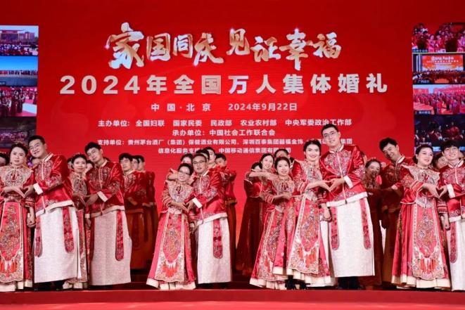 9月22日,由全国妇联、国家民委、民政部、农业农村部、中央军委政治工作部联合举办的“家国同庆 见证幸福”2024年全国万人集体婚礼圆满礼成。50个会场,5000余对新人(含香港、澳门和台湾地区)在全国人民的见证下,共同许下“相守一生、白头偕老”的幸福承诺。在迎接新中国成立75周年之际,万千家庭共庆新中国华诞,祖国见证每一个家庭的幸福时刻。