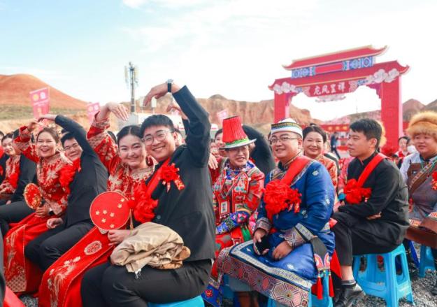 “集贤纳福,共缔良缘;执子之手,与子偕老”。9月22日,在“家国同庆 见证幸福”2024年全国万人集体婚礼甘肃张掖分会场,百对新人齐聚张掖世界地质公园七彩丹霞景区,在蓝天白云和秀美丹霞的映衬下,在亲人及观礼嘉宾的见证下,携手步入婚姻的殿堂。活动伊始,新人们在“抵制高额彩礼 倡导文明婚俗”打卡墙签名打卡、拍照留念,缔结一生爱的承诺。