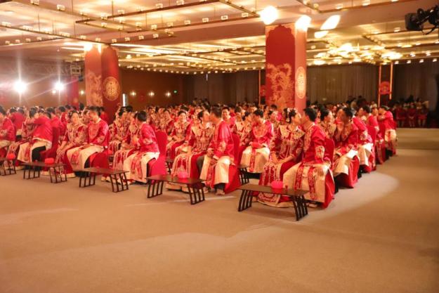 伴随着悠扬的乐声,新娘身着红色马面裙、身披五彩云肩,新郎着中式衬衣优雅入场。婚礼现场还特别邀请了当地的爱心书法家为228对新人手写婚书,一纸婚书,庄重神圣;以笔为媒,情注毫端。