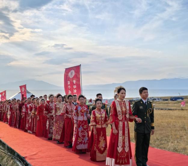 9月22日,“家国同庆 见证幸福”2024年全国万人集体婚礼新疆博州分会场,21对新人在美丽的赛里木湖畔缔结美好姻缘,开启人生新篇章。喜乐高奏,钟罄齐鸣,新人着中式婚服,行传统礼仪,向众人展示了一场庄重简约、饱含深厚文化底蕴的新时代中式传统婚礼。新疆博尔塔拉蒙古自治州副州长阿尔特为新人送上美好祝福;3对金婚伉俪现场见证幸福;新人们交换了戒指并深情拥抱。