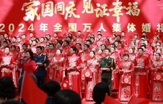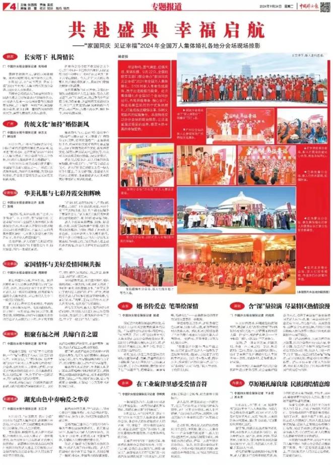 琴瑟和鸣,喜气满堂,佳偶天成,笑语欢颜。9月22日,全国妇联等五部门联合举办“家国同庆 见证幸福”2024年全国万人集体婚礼。5105对新人身着传统服饰,携手走进婚姻的殿堂。此次集体婚礼在全国50个会场同步进行,各地积极筹备、精心设计,将这场隆重热烈的中式集体婚礼,打造成推进婚俗改革、倡树文明新风的璀璨舞台。中国妇女报特选发部分分会场的现场掠影,让读者重温这场爱的盛典,感受至热至真的幸福爱情。