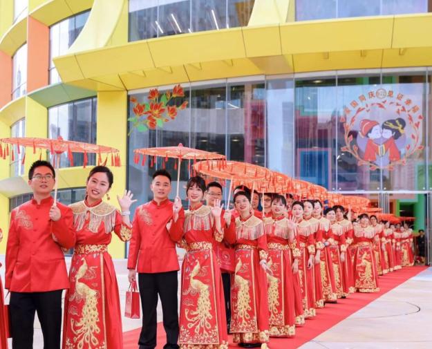 除主活动流程外,为营造婚恋浓厚氛围,深圳分会场还在南头古城、中山公园、荷兰花卉小镇等地延伸开展婚恋文旅系列活动,如新人共做一件事,打卡“祖国,见证我们的幸福”祝福墙,录制祝福视频,传递对祖国的美好祝愿。活动不仅丰富了新人的体验感,也让新人感受到了深圳这座年轻城市的浪漫与热情。