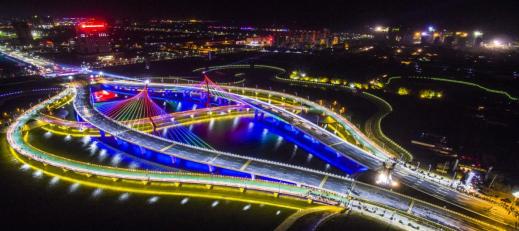 彩虹桥像两把拉离湖面的弯弓,船型构造又融入了太极阴阳八卦的元素设计。每当夜幕降临,西峰区彩虹桥西侧水域,音乐喷泉、水幕电影依次上演,流光溢彩,美轮美奂,与彩虹桥交相辉映,吸引众多市民驻足。整座桥横跨南湖生态集雨工程,桥体红黄绿紫等氛围灯闪烁变幻,在夜幕的衬托下,如一道彩虹,与城区的灯光夜景相得益彰,美不胜收。