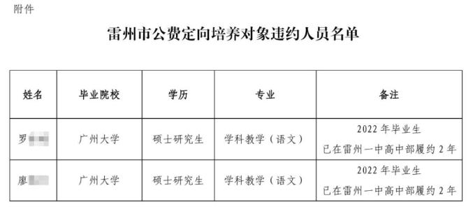 湛江市雷州市9月5日,雷州市教育局发布《关于罗xx等2名公费定向培养对象违约情况的通报》,通报称: