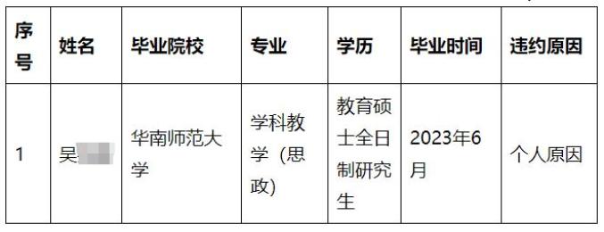 9月6日,龙川县教育局发布《广东省公费定向培养粤东粤西粤北地区中小学(含幼儿园、特殊教育学校)教师龙川县违约名单》,文中称: