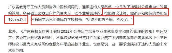 据此前广东省教育厅工作人员接受媒体采访时表示,通报违约人员名单,也是为了加强对公费定向生的履约管理。
