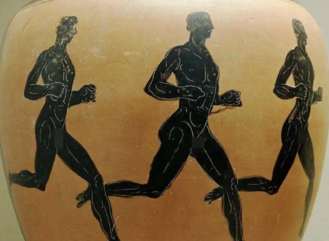 三个跑步的人,阿提卡黑绘双耳瓶局部,