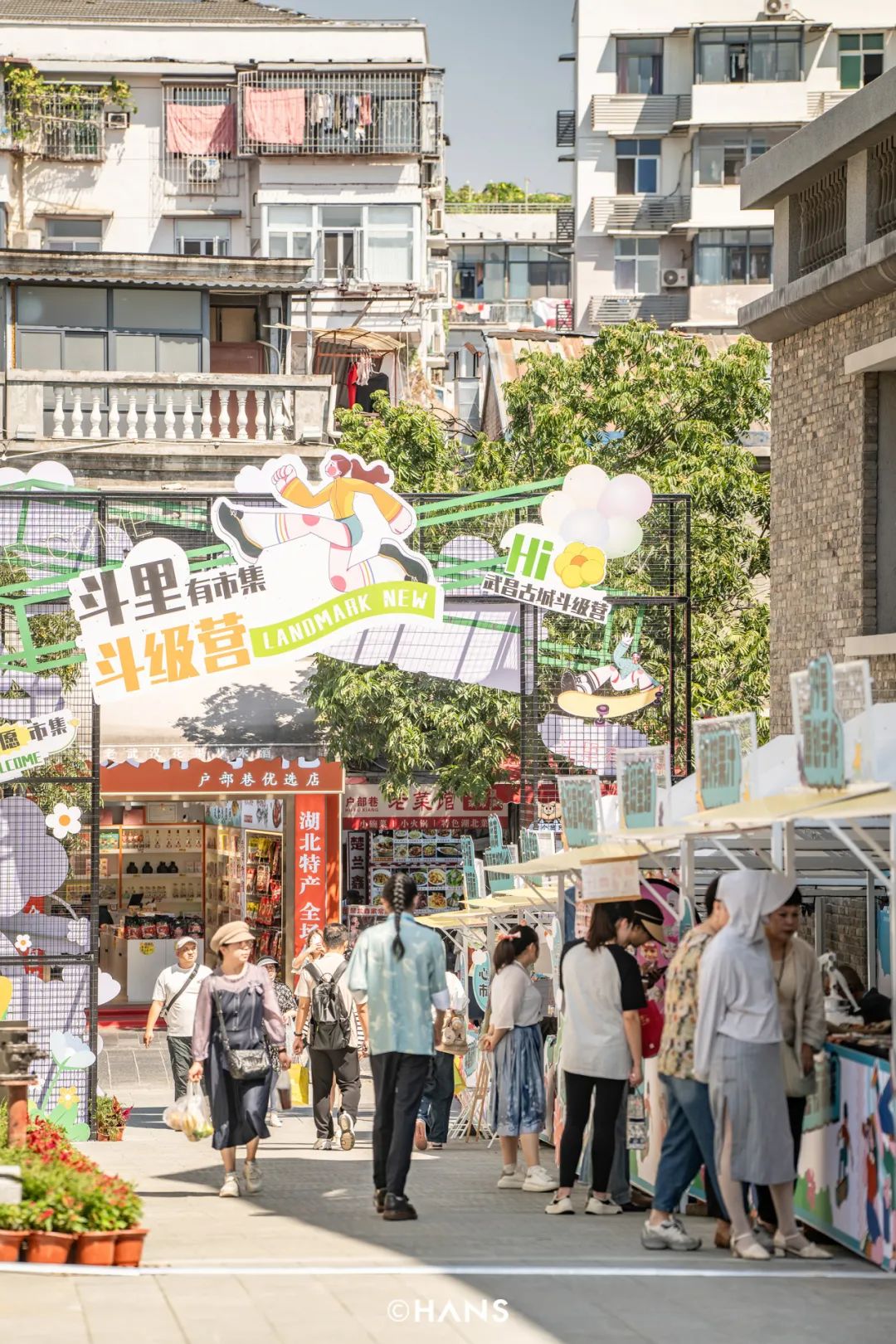 走进斗级营,市集热闹,空气中弥漫着咖啡和蛋糕的香气,摊位有地大珠宝、兰亭书画……不少是武汉知名手作品牌。
