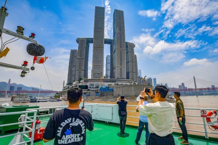 “半岛小渡”航线从九龙半岛直达渝中半岛,游客可乘船打卡长江索道、湖广会馆、海军166舰等观光点,这条线路也填补了水上观光线路无长江上行线路的空白。上游新闻记者登船体验,沿江打卡诸多景点。