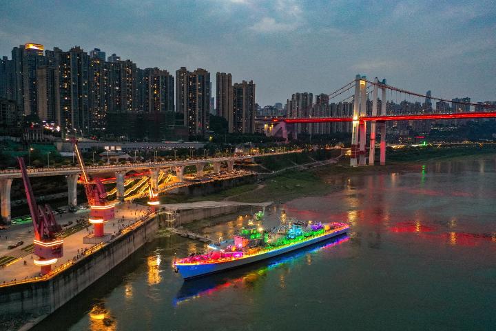上游新闻记者看到这些别具特色的观光点,还近距离领略跨江大桥的独特风姿。这些景点和特色建筑,如同珍珠般散落在长江两岸,为航线增添了无尽的魅力。“半岛小渡”在经过鹅公岩大桥之后,最终停靠在重庆建川海疆博物馆(166舰)。这条线路也填补了水上观光线路无长江上行线路的空白,为两江四岸沿线的城市文旅品质提升增加了新的亮点。