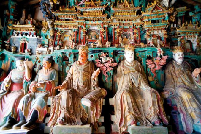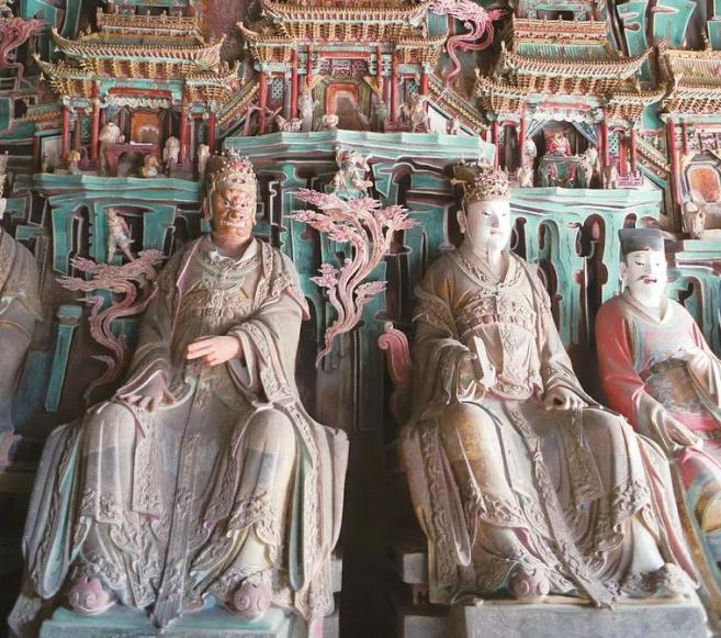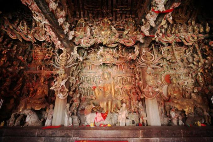 观音堂塑像原有1000多尊,历经岁月变更,现存各类塑像500多尊,是如今保存最完整的全国四处明代悬彩塑中的一处。广三间、深两间的殿堂内,塑像或设在坛上,或悬于空中,彩塑、悬塑相间,儒、释、道三教共融。其中,观音、文殊、普贤三大士造像居中,十八罗汉、二十四诸天环绕,每一尊都栩栩如生、精美绝伦。