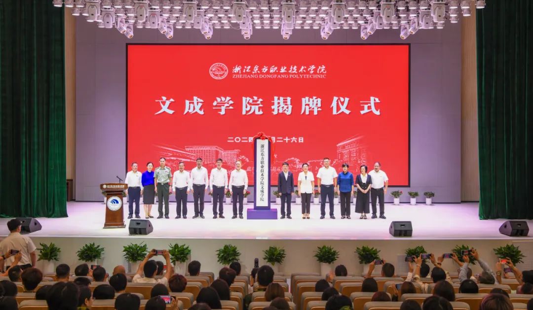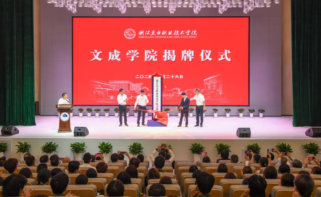 仪式上播放了文成学院宣传片,卢智旭、杨德听、朱景高、陈加泽共同为浙江东方职业技术学院文成学院揭牌。