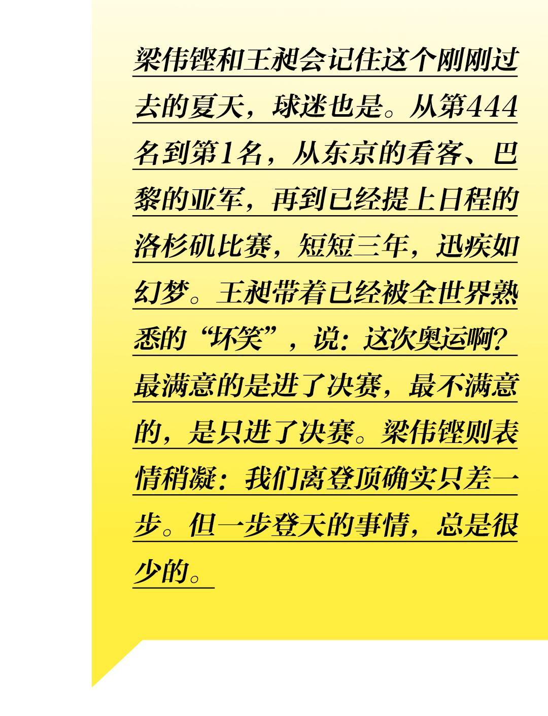 或许大家都希望回到梁王最初出发的地方看看,回忆一下,他们是如何从世界视野之外的小透明,一路打到世界排名第一、奥运夺冠热门的,看看这条路他们走得如何顺利,又如何艰辛。
