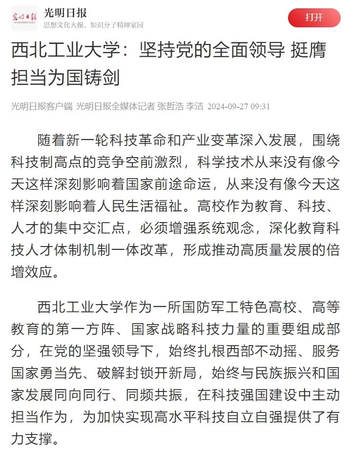 原标题:《党代会 |《光明日报》:西北工业大学坚持党的全面领导 挺膺担当为国铸剑》