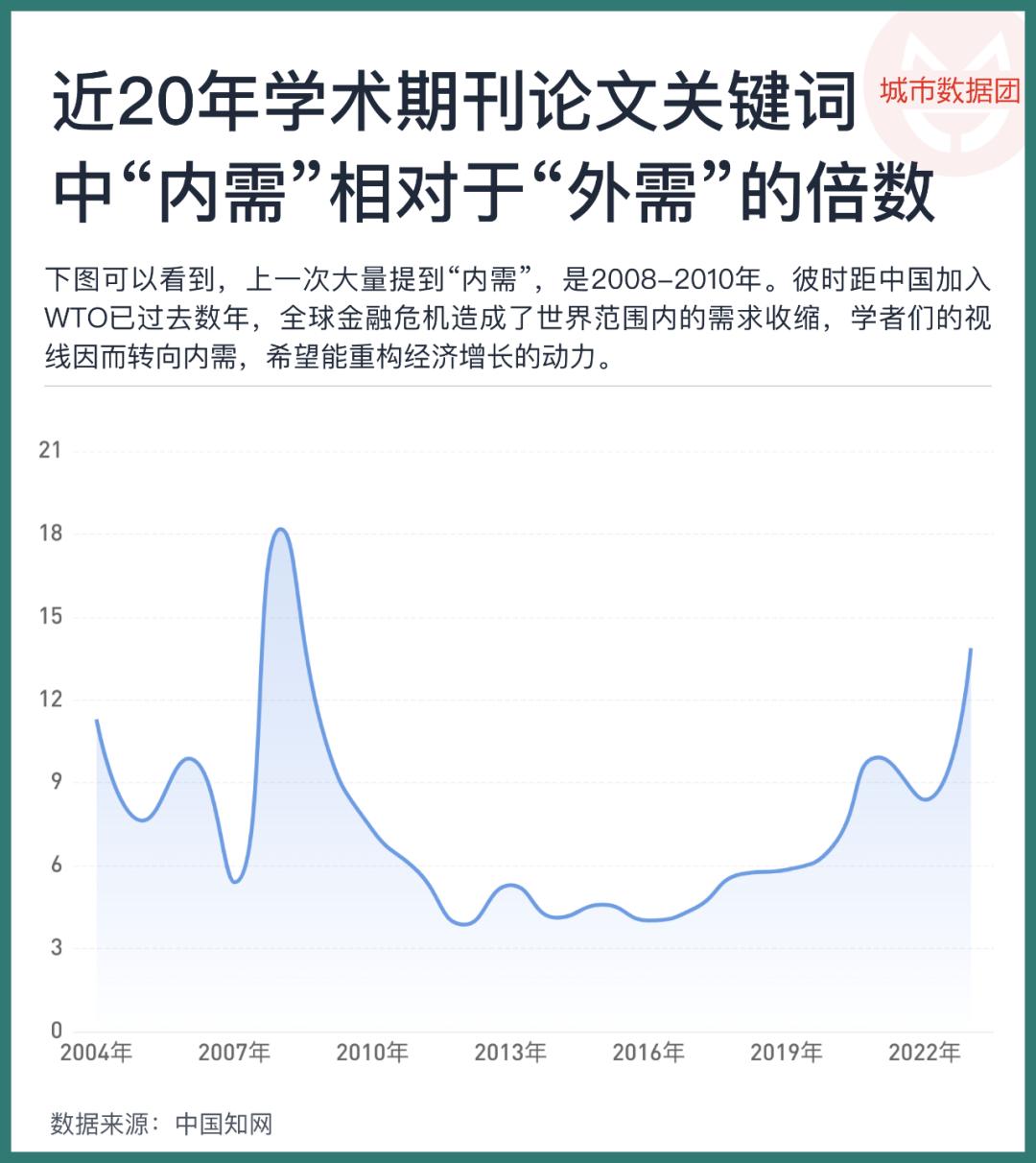 可以看到,上一次大量提到“内需”,是2008-2010年。彼时距中国加入WTO已过去数年,全球金融危机造成了世界范围内的需求收缩,学者们的视线因而转向内需,希望能重构经济增长的动力。
