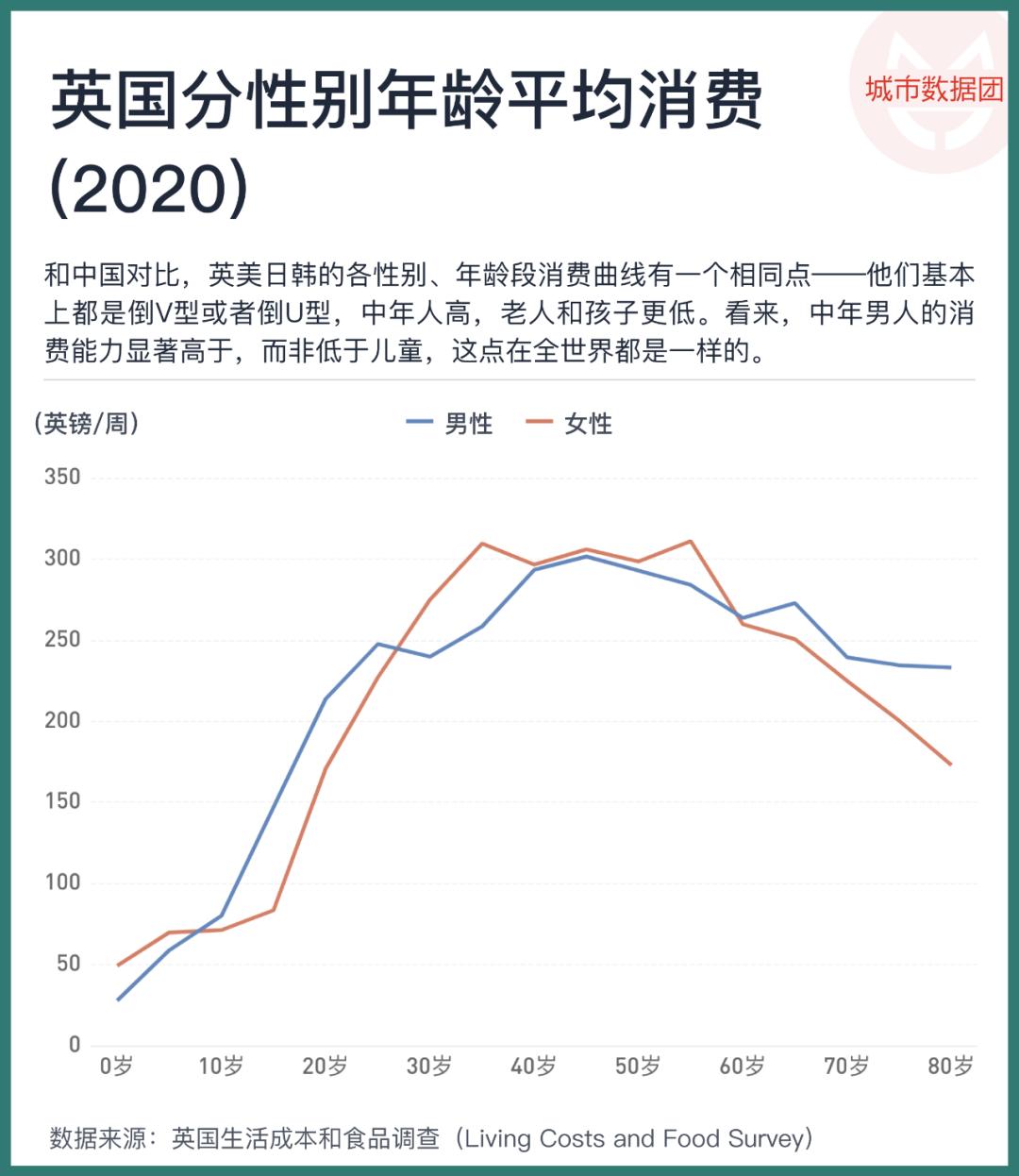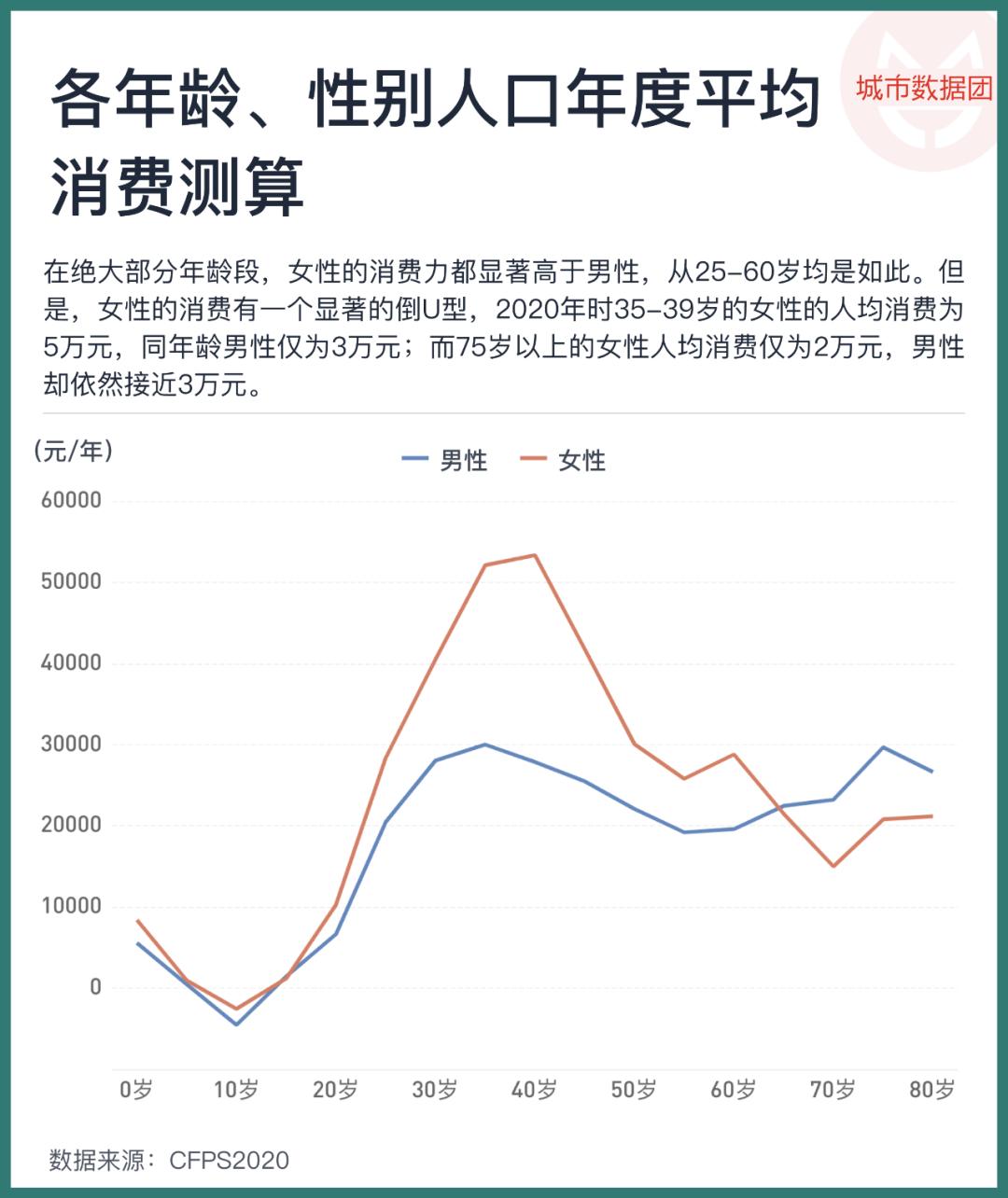上图的两条曲线,代表2020年男性和女性在各年龄段的平均消费。比如在上图中,35-39岁的女性对应的数值是5万元,其含义为:一个家庭每增加一名35-39岁的女性,这个家庭的总消费会增加5万元。