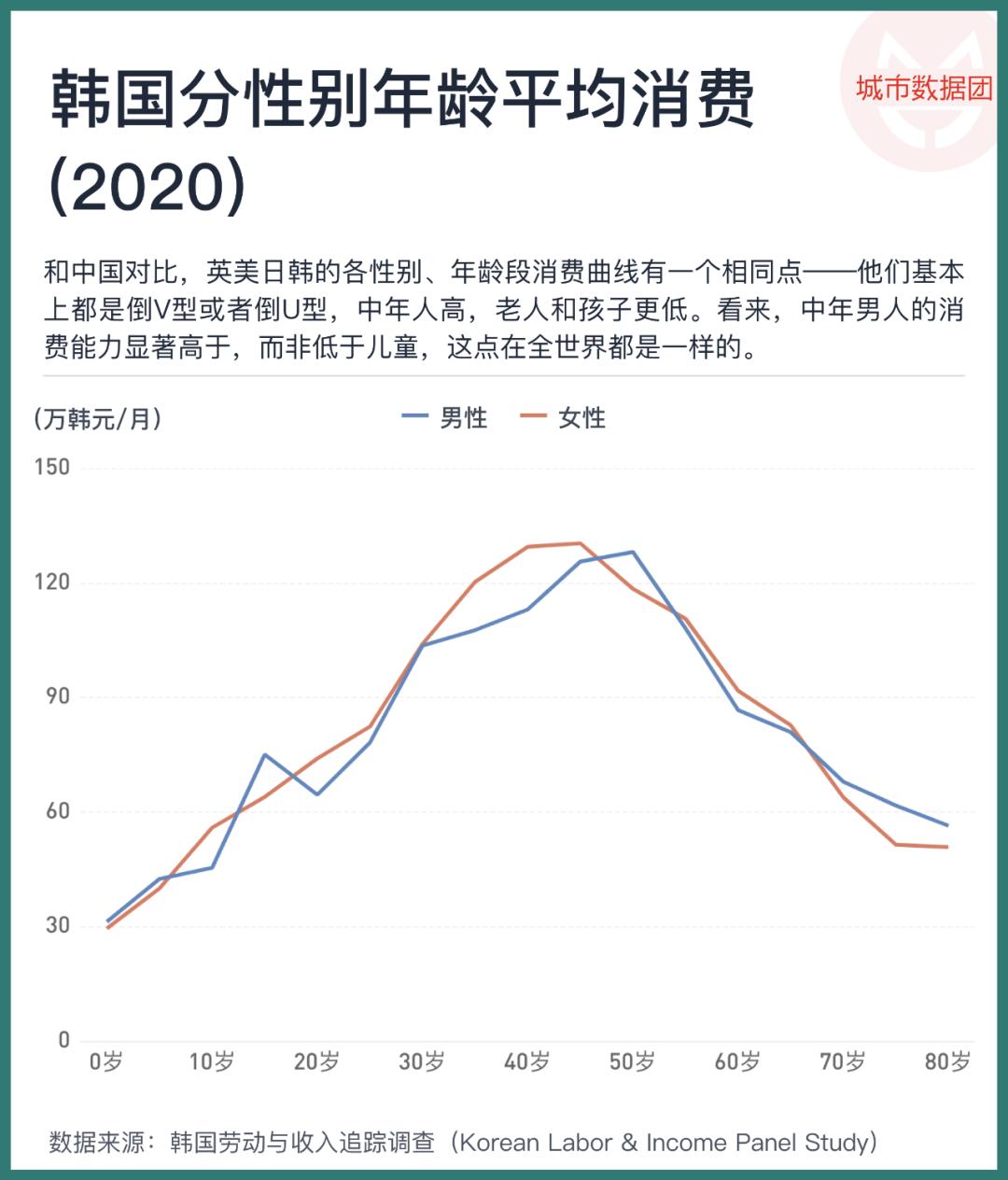 和中国对比,英美日韩的各性别、年龄段消费曲线有一个相同点——他们基本上都是倒V型或者倒U型,中年人高,老人和孩子更低。看来,中年男人的消费能力显著高于,而非低于儿童,这点在全世界都是一样的。