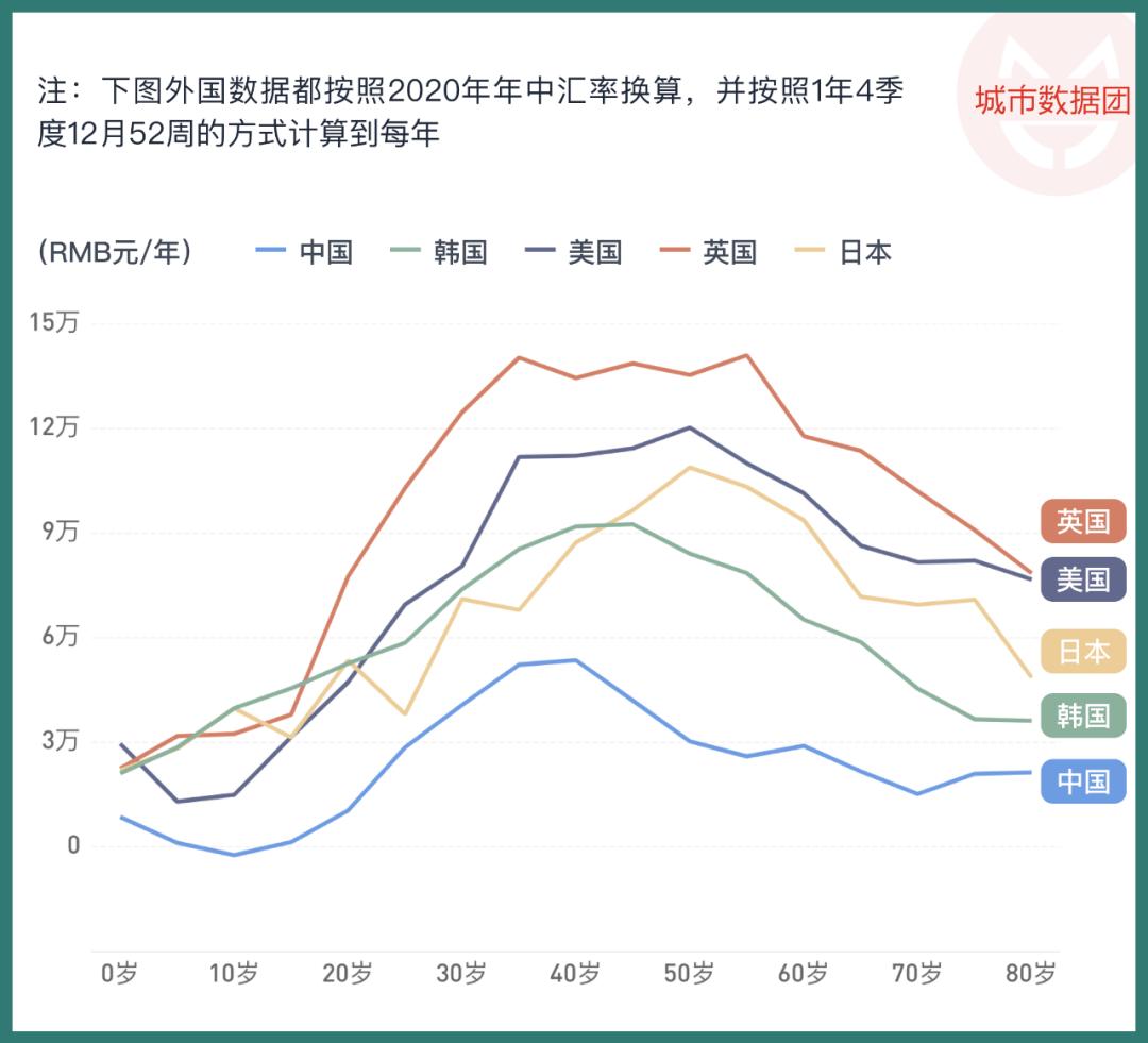在消费的低窗口,人们的体力、智力、职业竞争力都开始降低,收入增长放缓,加之退休临近,子女一般也已经能够自立,可以松一口气。不同国家、不同时间出生的人口,都在这个区间经历了消费增长的停滞。
