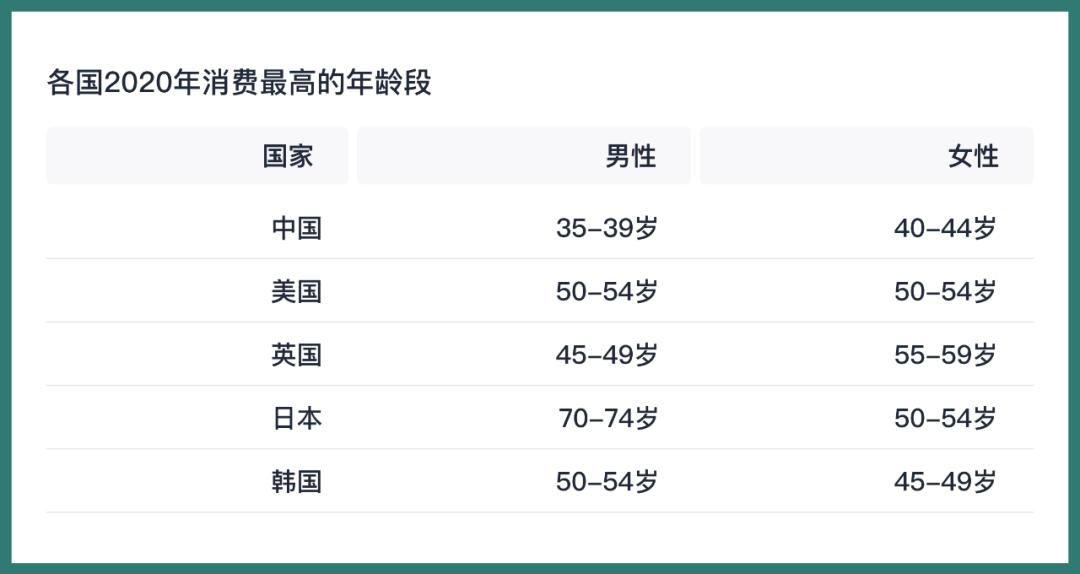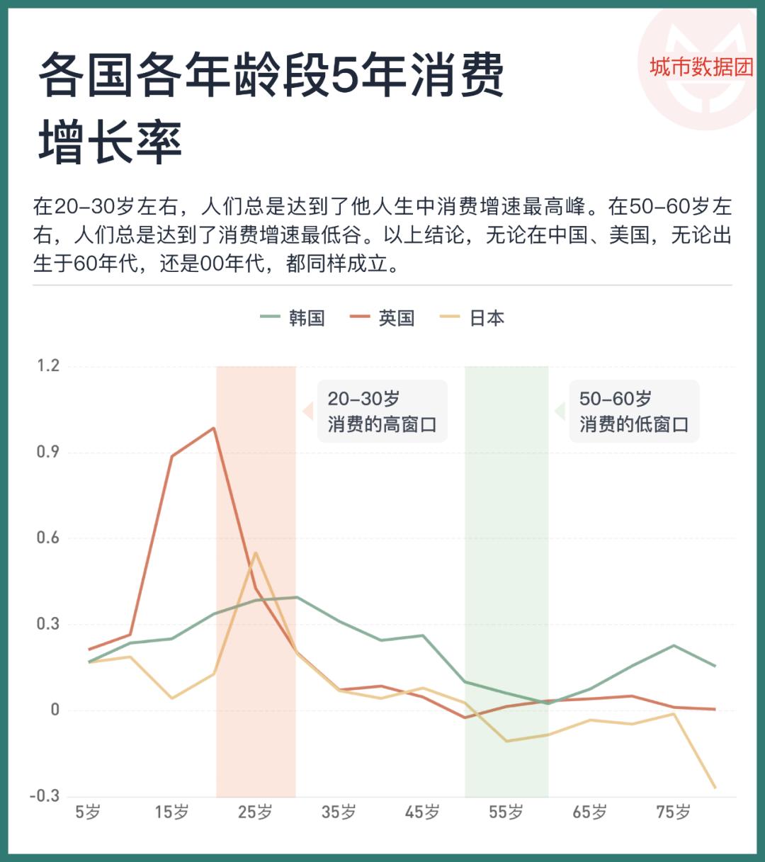 在消费的高窗口,年轻人走出大学,迈向社会,开始有第一笔收入,有自己的人生规划,想要过上更好的生活。不同国家、不同时间出生的人口,都在这个区间经历了消费增长的加速。