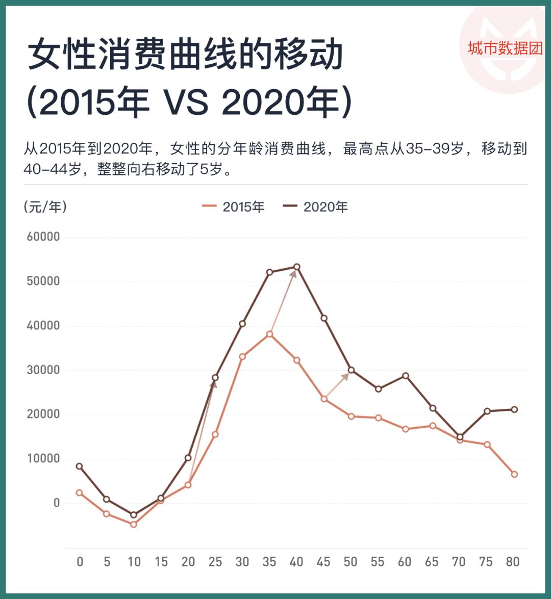 在上文中,我们画出了2020年的各性别、年龄段人口的消费曲线,那么用2015年调查总队数据做同样的计算后,将两条女性消费曲线放在一起,得到下图——